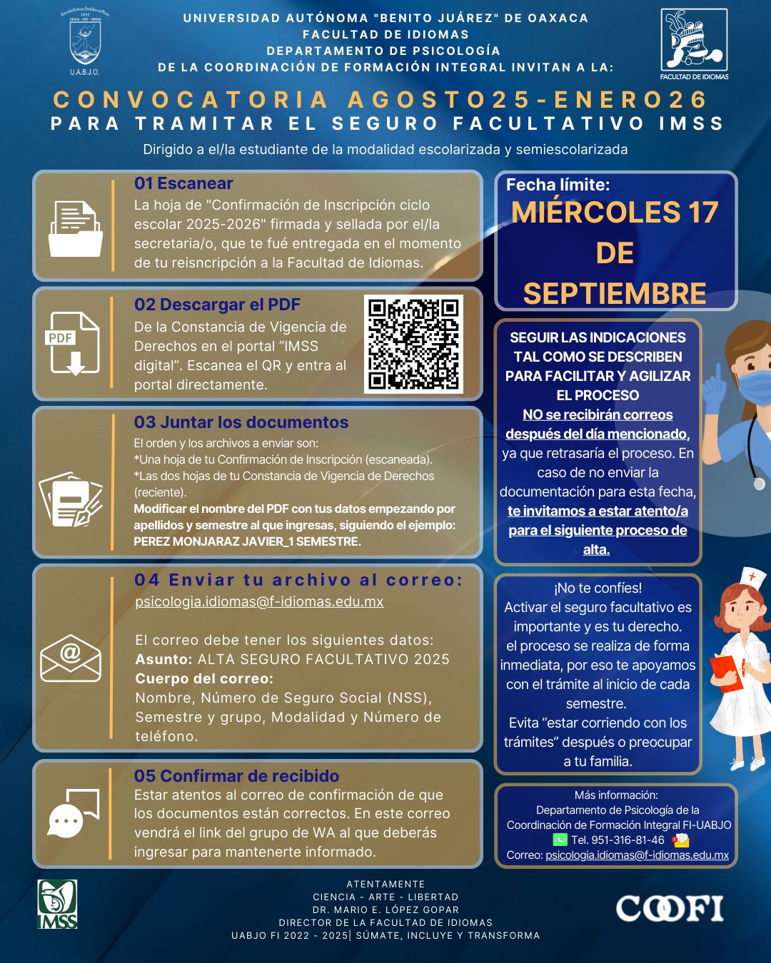 Deberás rellenar con puño y letra el oficio de solicitud de baja y adjuntar copia de credencial de elector del interesado/a (escaneado) y el PDF de la constancia de vigencia de derechos reciente (donde conste que aún está dado de alta por la Universidad) recuerda que puedes descargar tu CONSTANCIA DE VIGENCIA DE DERECHOS en la página del IMSS https://www.imss.gob.mx/imssdigital.